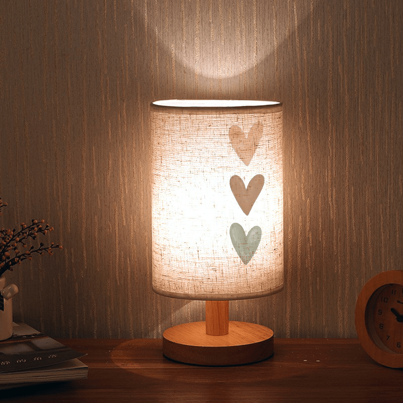 Three Heart Print Ambient Bedside Lamp, Wood Tone Table Lamp with Fabric Shade for Bedroom and Dormitory LED Light – USB Powered – No Batteries Needed – Suitable for Home and Office Use, Perfect Gift